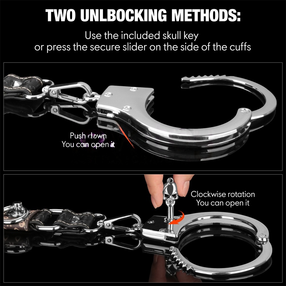 They feature two unlocking methods: use the included skull key or press the secure slider on the side of the cuffs.