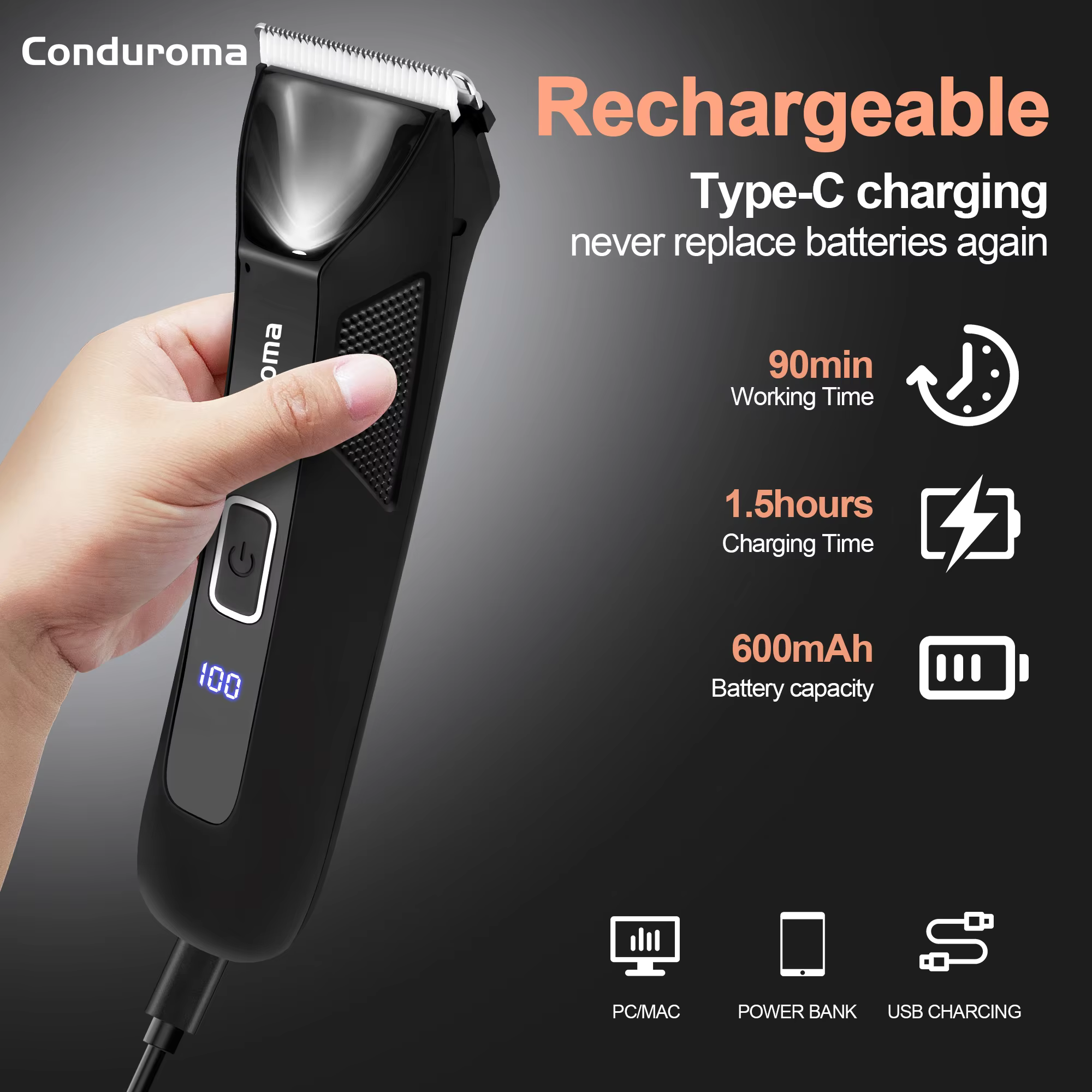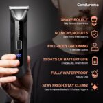 This Waterproof Electric Body and Hair Trimmer for Men features a ceramic blade, offering a very quiet and safe grooming experience. With a rechargeable lithium battery providing over 90 minutes of runtime, it supports USB charging and includes a travel lock function for convenience. Its waterproof design ensures easy cleaning, while the LED display enhances usability.