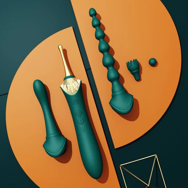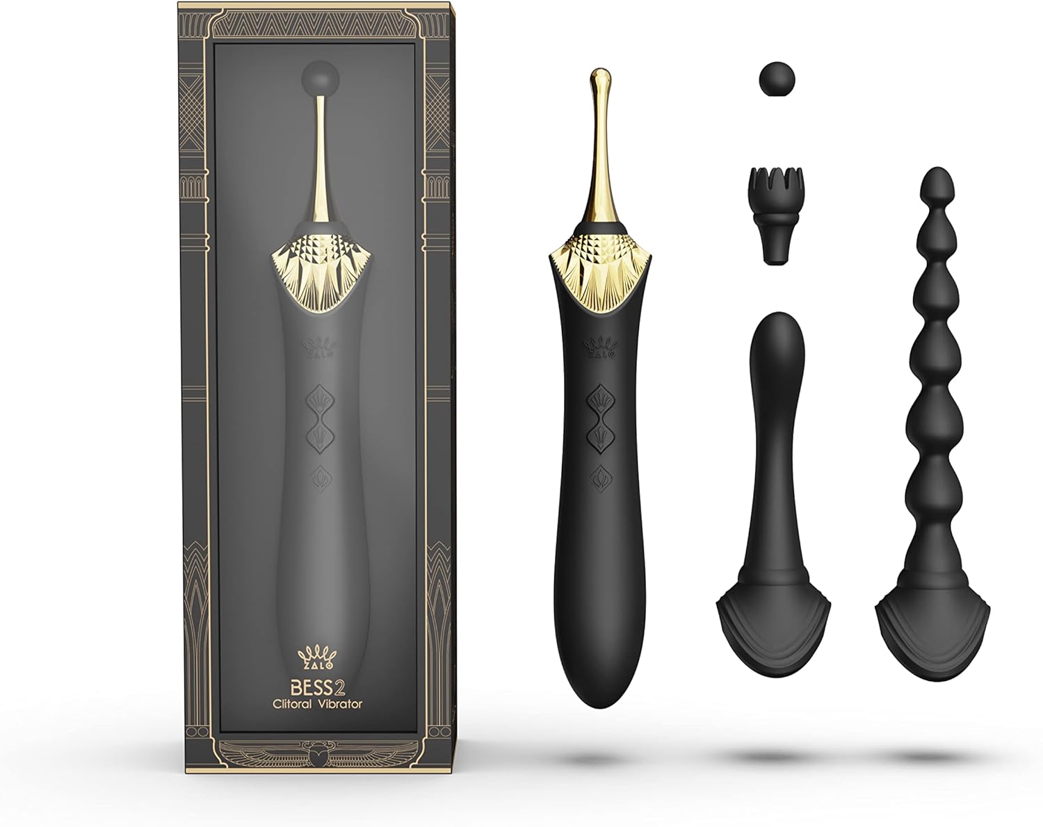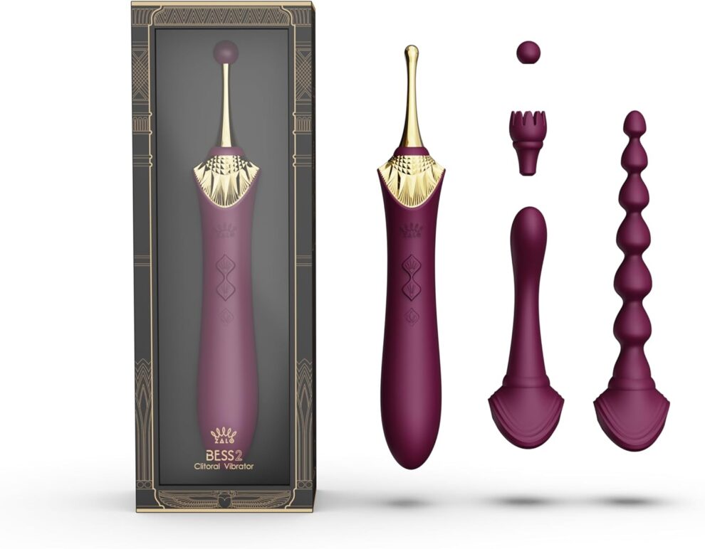 In the box: Bess, 1 ball-shaped attachment, 1 petal-shaped attachment, 1 G-spot attachment, USB charging cable, satin storage pouch, instructions manual, warranty card